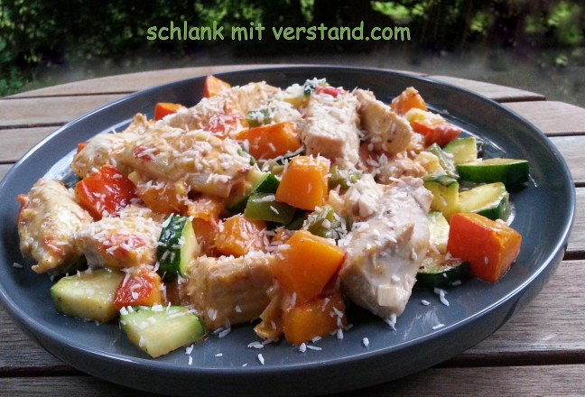 Auch bei diesem Gericht kann man die Zutaten austauschen. Pute statt Hähnchen, Kohlrabi statt Zucchini…