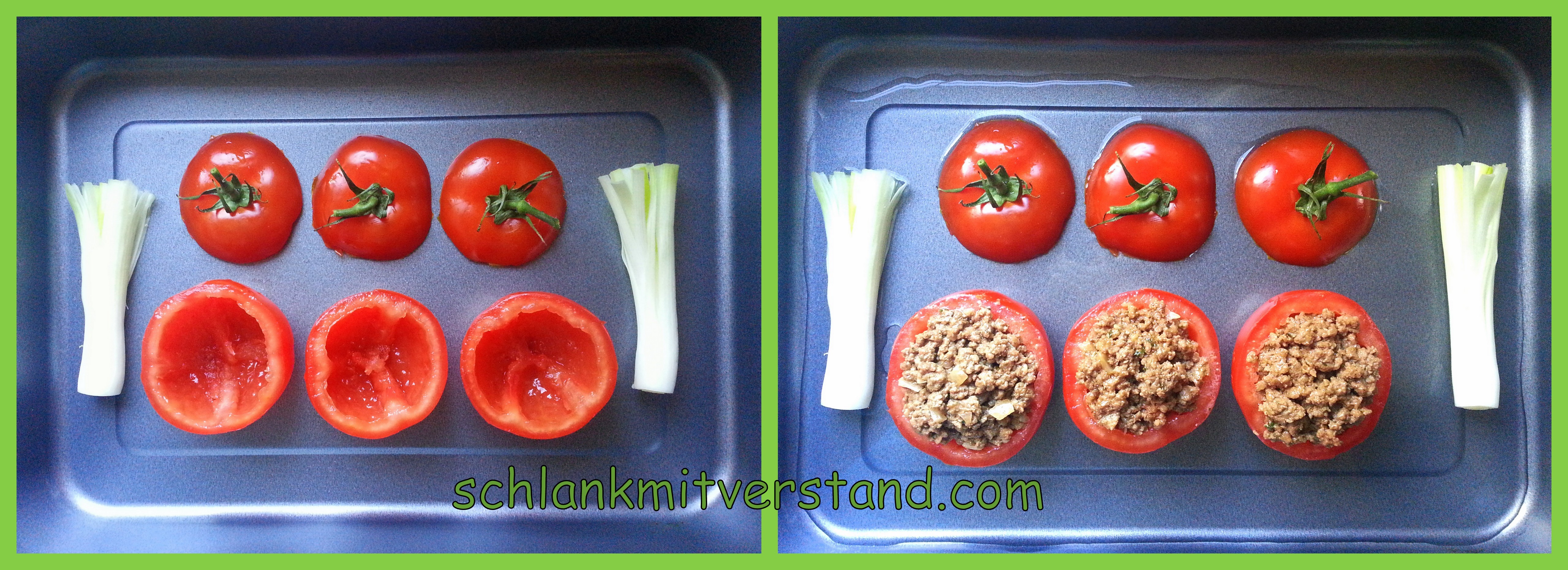 Die fertige Hackfleischmasse in die Tomaten füllen und in eine Auflaufform stellen.