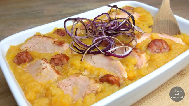 Manchmal nehmen wir statt der Petersilienwurzel auch 2 Kohlrabi und am liebsten mögen wir ihn mit knusprig gebackenen Zwiebeln.