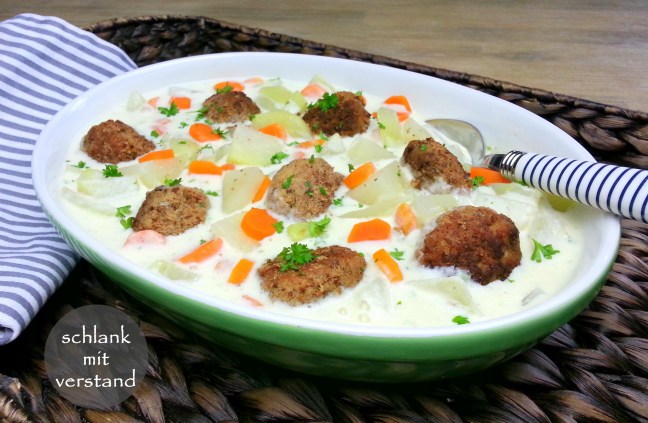Deftige Fleischbällchen mit viel Gemüse in einer hellen, cremigen Sauce… der low carb Wikinger Topf. Passt zu jeder Jahreszeit.