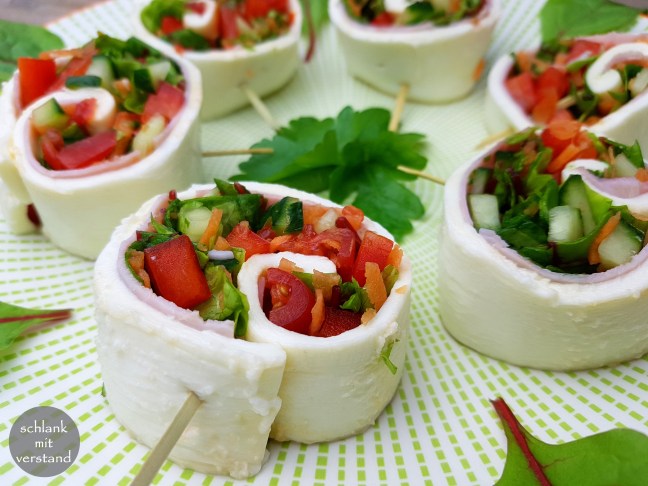 • Den Wrap in ca. 4 cm breite Scheiben schneiden und mit den Schaschlikspießen fixieren.