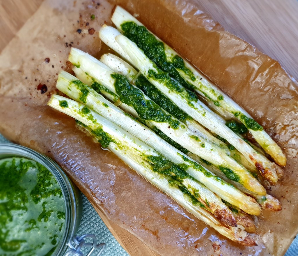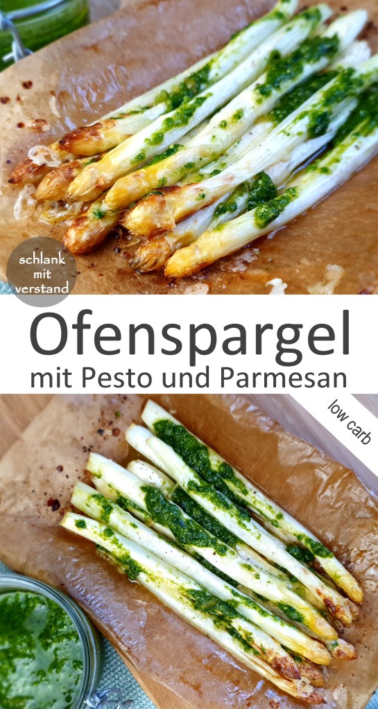 Im Backofen gegarter Spargel mit Pesto und Parmesan. Eine einfache und gesunde Mahlzeit mit wenigen Kohlenhydraten (low carb).