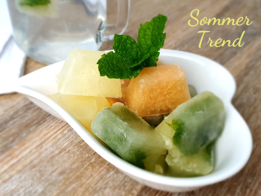 Das sind Eiswürfel selber hergestellt aus frisch gepresstem Zitronensaft, pur, mit frischen Minzblättern oder geriebenem Ingwer.