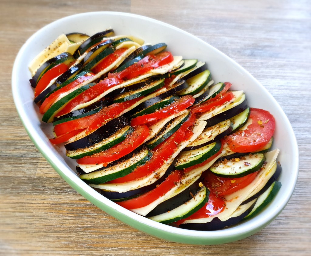 - Alles abwechselnd in eine Auflaufform schichten.