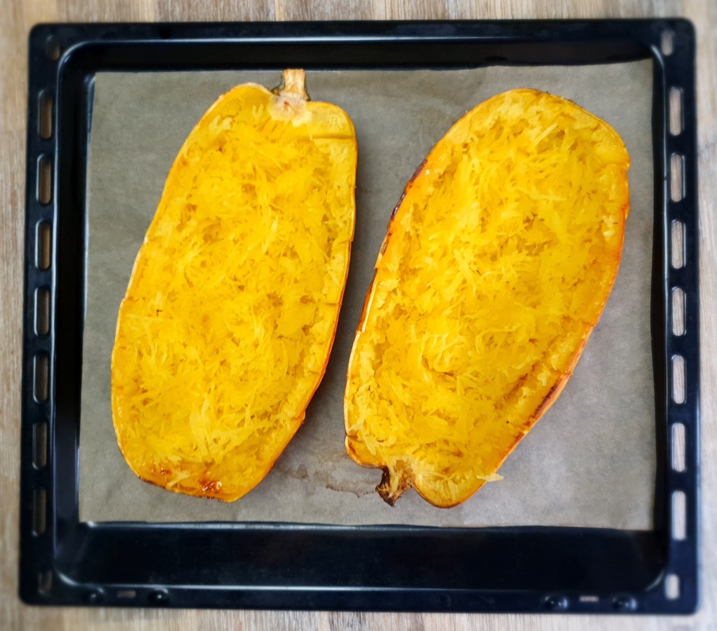 - Die Kürbishälften aus dem Ofen nehmen und das Kürbisfleisch mit einer Gabel lose kratzen (siehe Foto oben) und mit Salz, buntem Pfeffer und etwas Kürbisgewürz würzen.