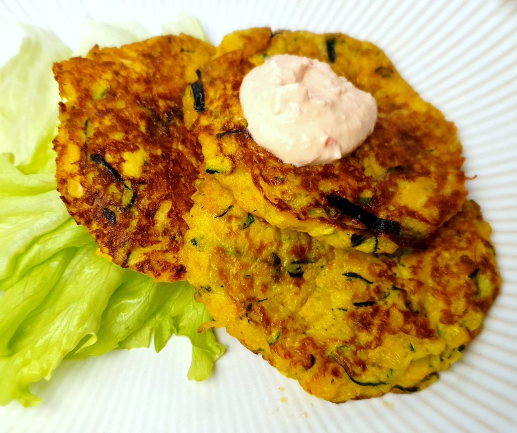Leckere Puffer aus Kürbis und Zucchini mit Ei und Frischkäse.