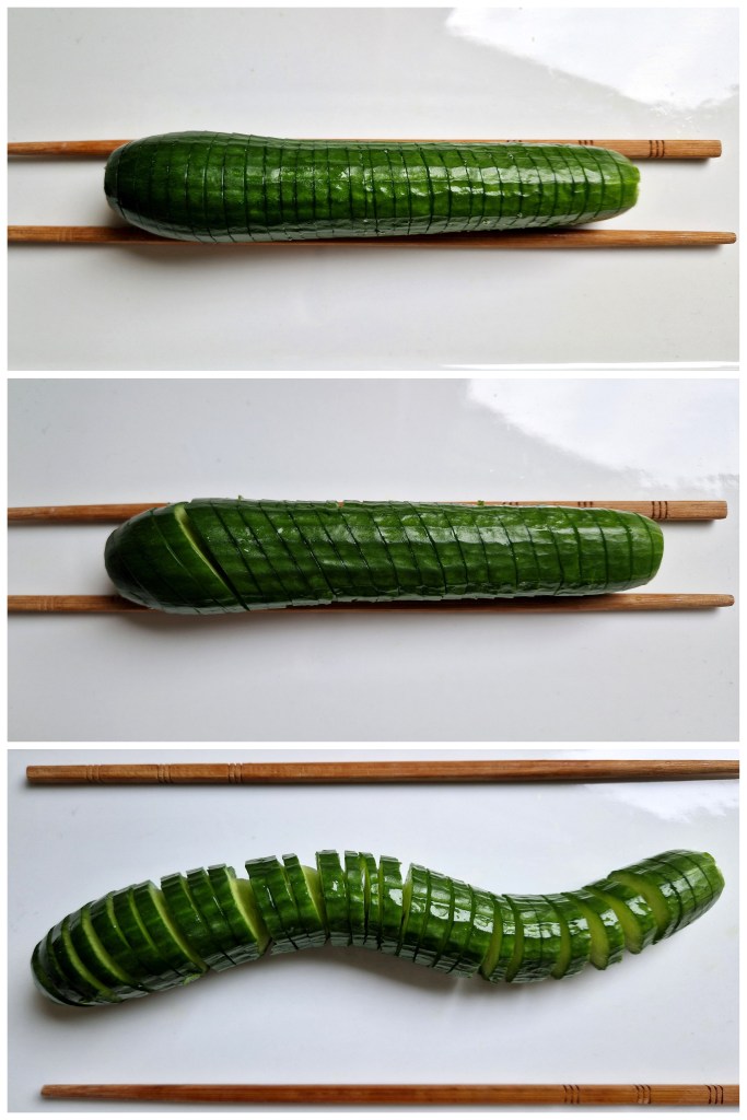 - Jeweils eine Gurke zwischen 2 Essstäbchen legen, von der einen Seite mit einem Abstand von 0.5 cm gerade einschneiden, umdrehen und von der gegenüberliegenden Seite schräg enschneiden (siehe Foto oben)